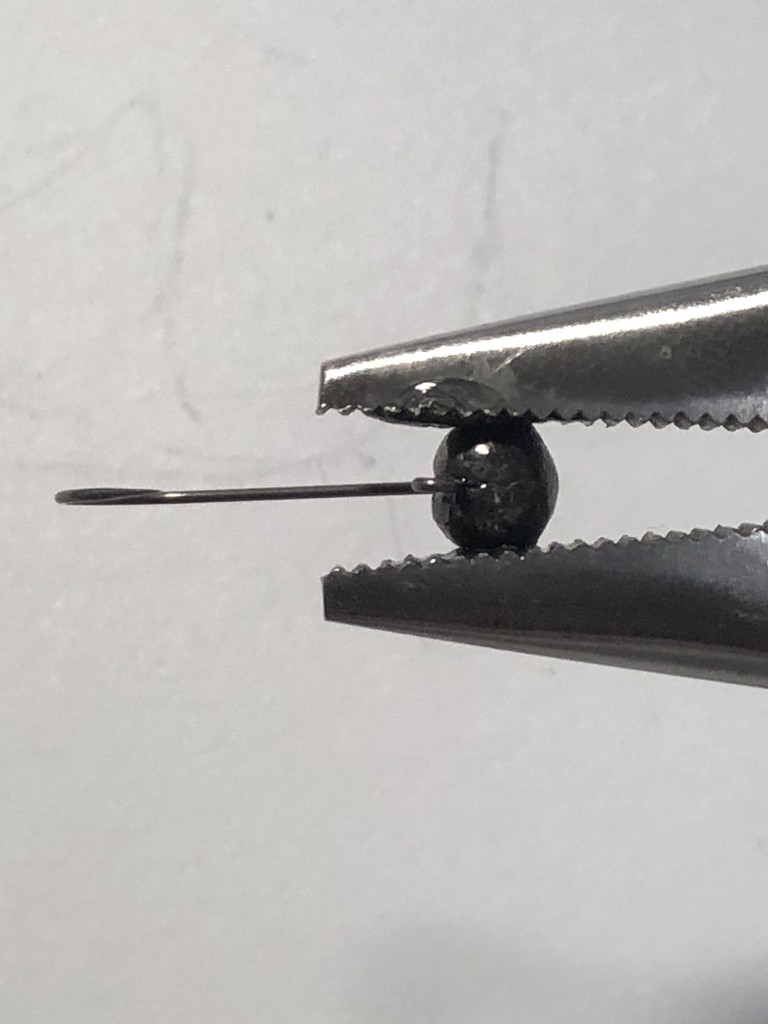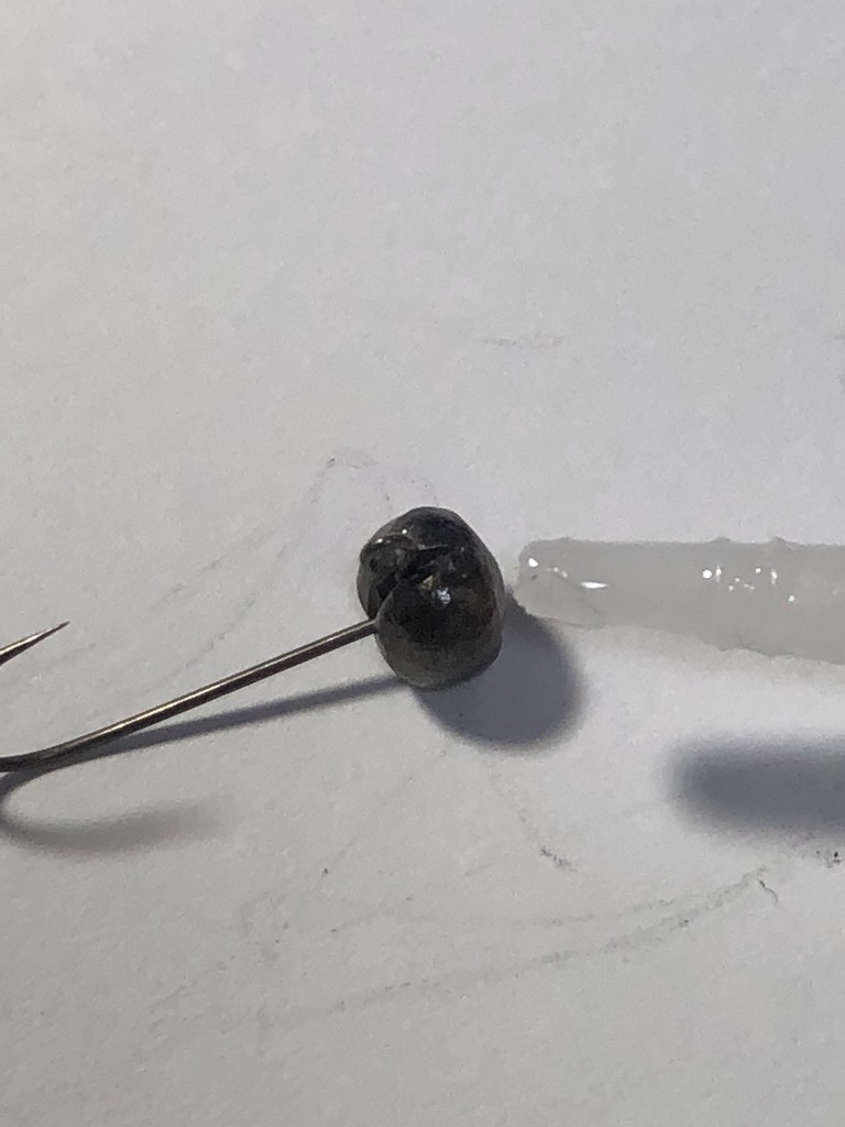 その後、ガン玉の割れ目に瞬間接着剤をちょっとだけ流し込み、ペンチで割れ目が引っ付く程度に挟みます。