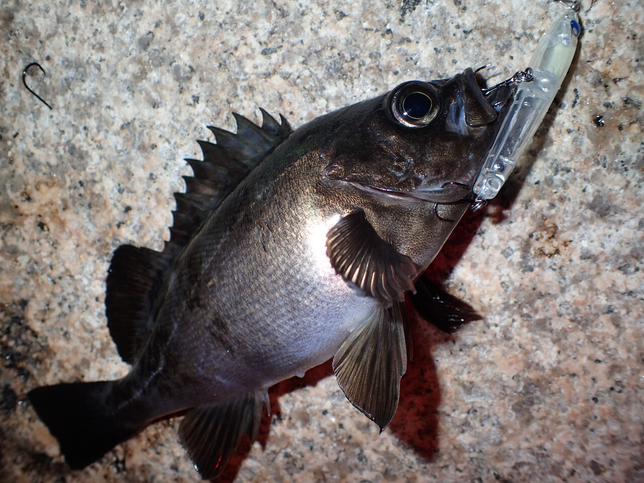 水深が何メートルあるのかわかりませんが、これまで使っていたブルーカレント76TZではボトムで20センチを超える魚をヒットさせた場合、ゴリ巻きしてもロッドが曲がり過ぎて手前の石に潜られたり、根ズレでラインブレイクする事がありました。