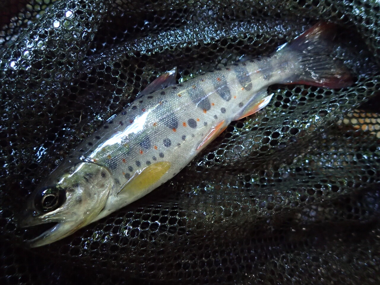 写真を撮る前にネットから逃げてしまったので、そこは残念でしたが、「この川にアマゴはいる!しかもコンディションが良い!」と思わずはしゃいでしまうくらい美しい魚でした。