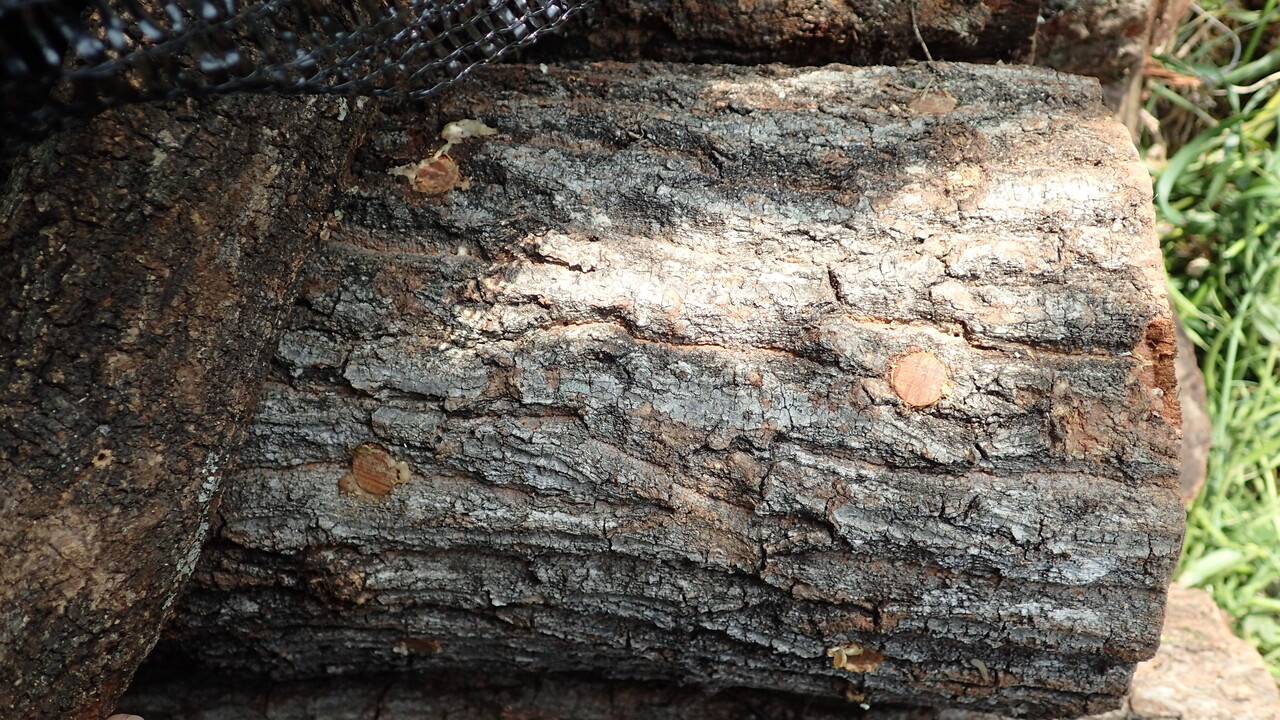 程よいサイズに切り分けたクヌギの木に穴を開け、そこに菌を埋め込んで乾燥し過ぎない環境で放置しておけば次の年には椎茸が生えて来ます。