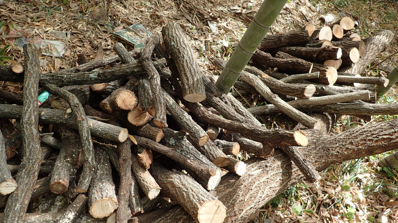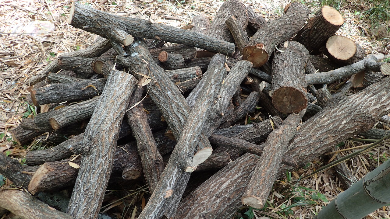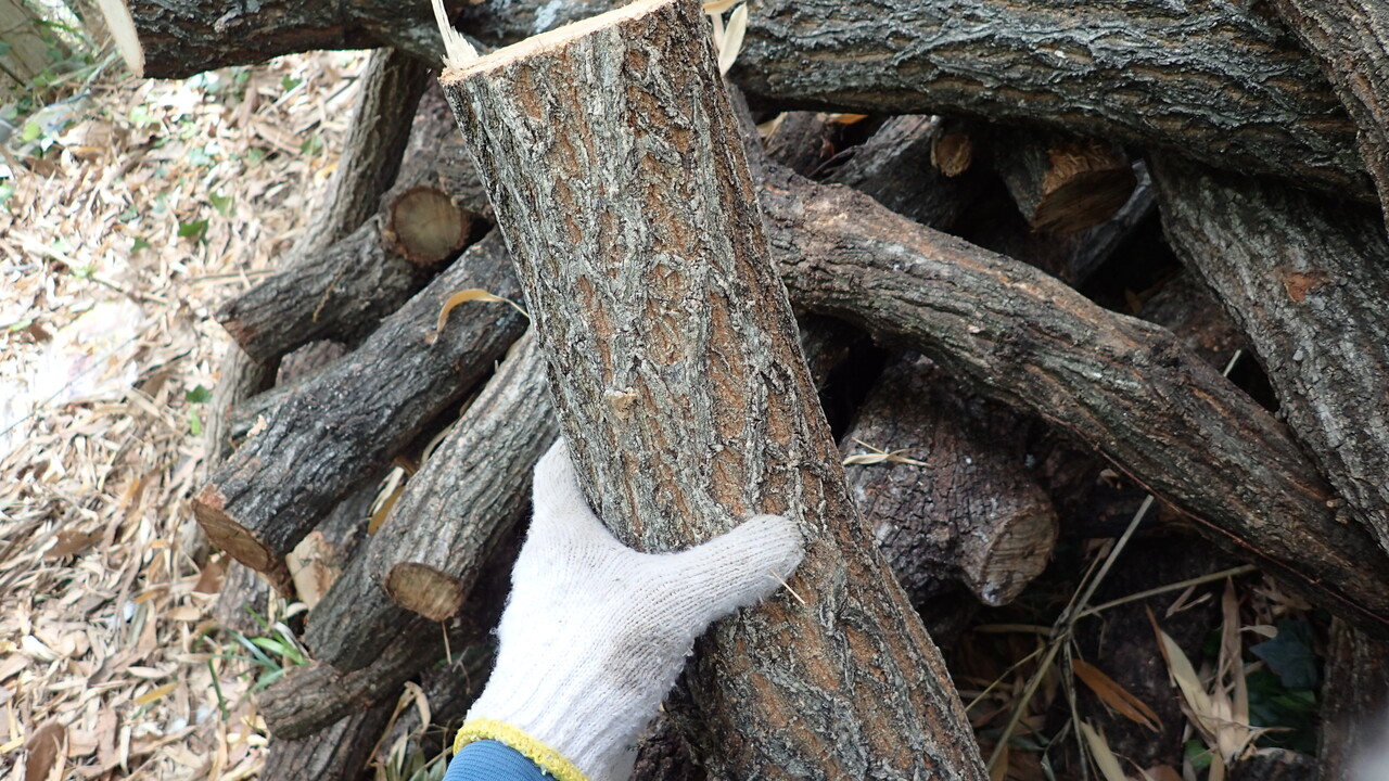 - クヌギ、コナラを冬の間に伐採し、日光の当たらないところで1ヶ月以上乾燥させる。
