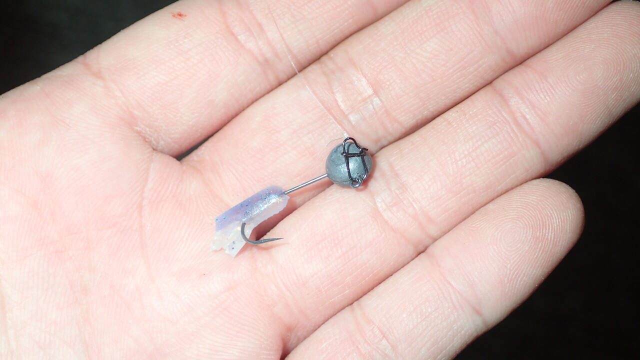 そこでジグヘッドの重量を水面を攻めやすいように軽くし、ワームはタイドカーリー2インチをさらに短くちぎって使用しました。