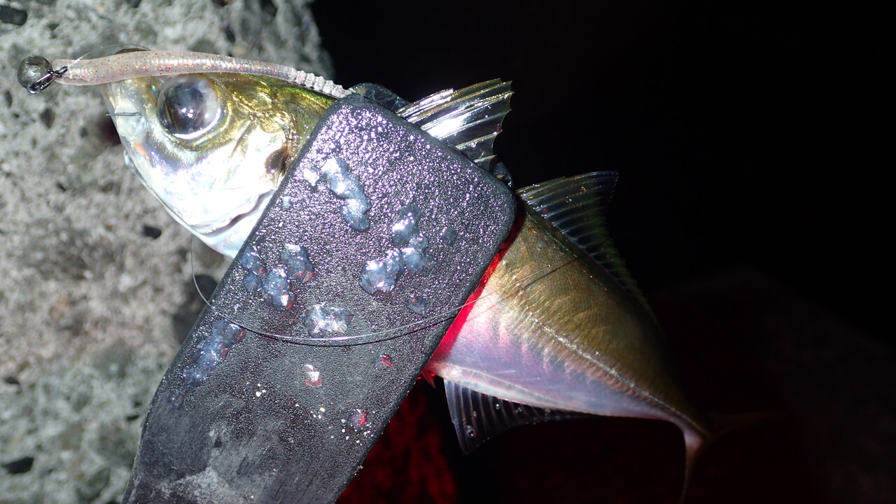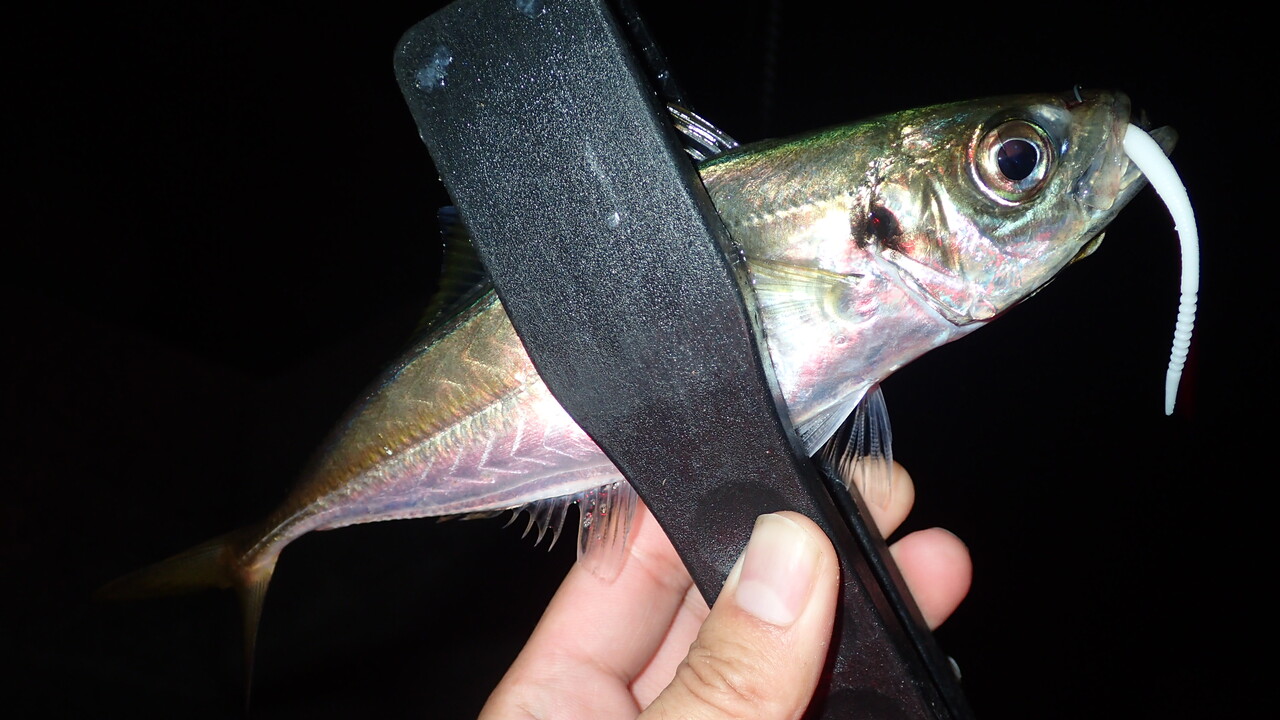 帰り道にとあるポイントへ寄ってみると1尾だけ20センチを超えるアジがヒットしました。