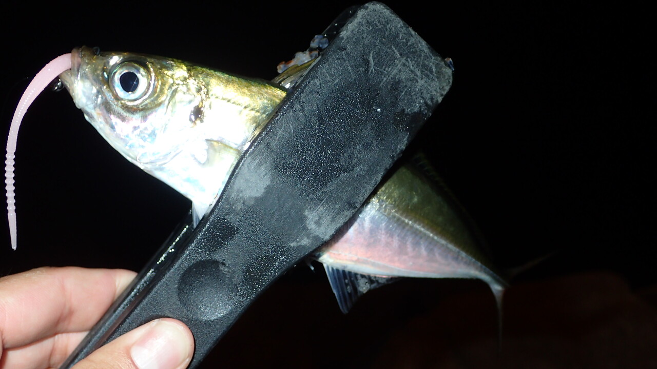どうやら20センチ以上のアジと、15センチほどのアジが混ざっているらしくワームのしっぽだけ咥えるアタリを上手く感じ分けて、ロッドで聞きながらフッキングを決めていきます。