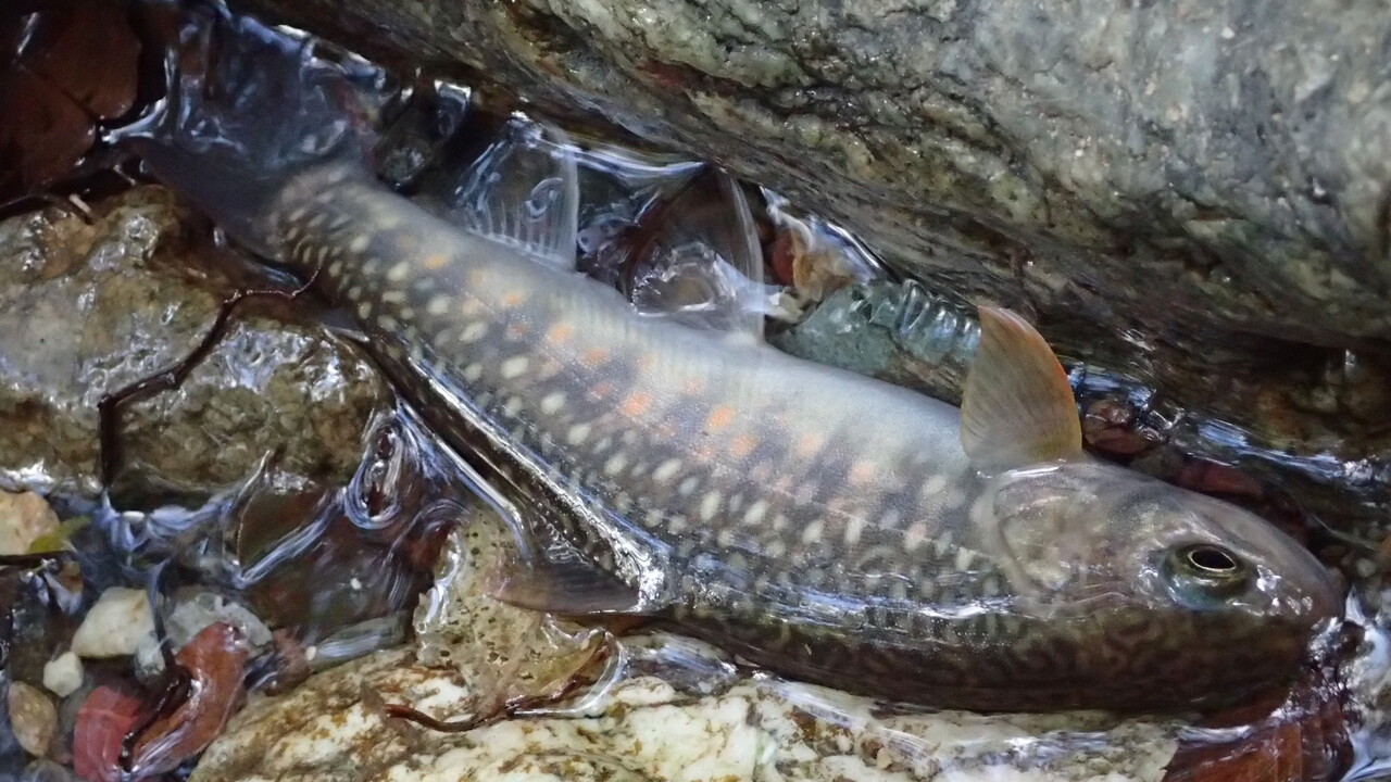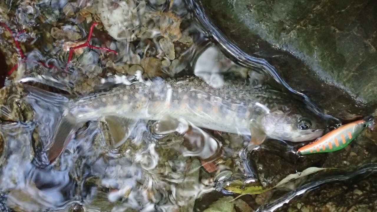 チェイスして来た魚に対して若干スピードを落としてトゥイッチをすると、綺麗なイワナが顔を見せてくれました。