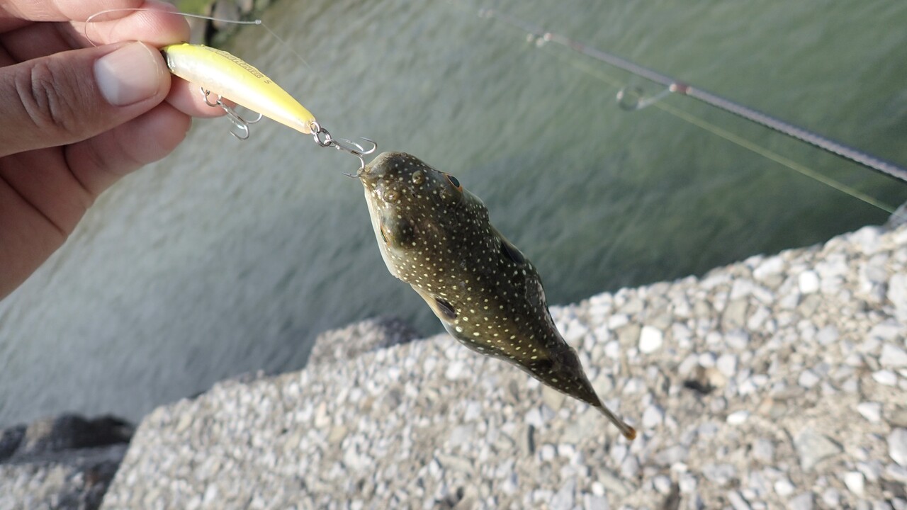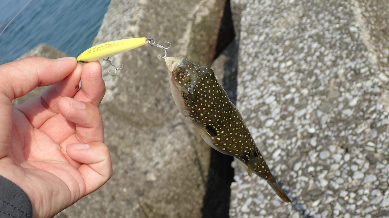 再びショアジギングタックルの練習に戻ったところで、私はメバルハンターにフグが寄って来ているのに気が付きました。