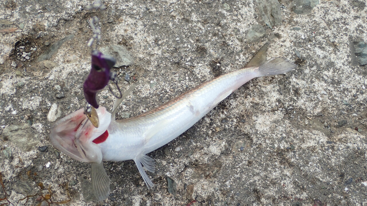 その後は小アジばかりで、何とかフッキング率をアップさせるためにタイドカーリーを短くちぎり、ジグヘッドも1gまで軽くして表層のただ巻きで仕留めています。