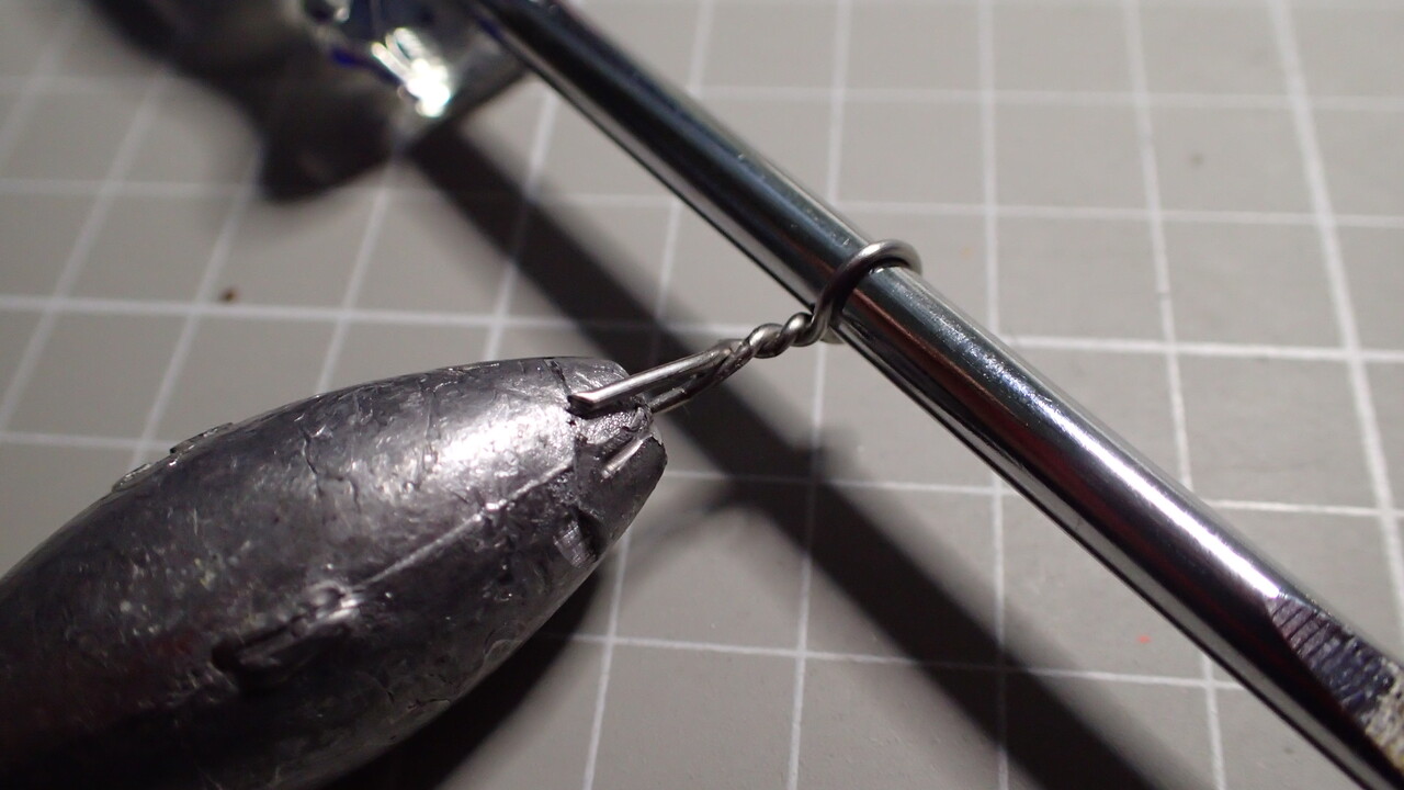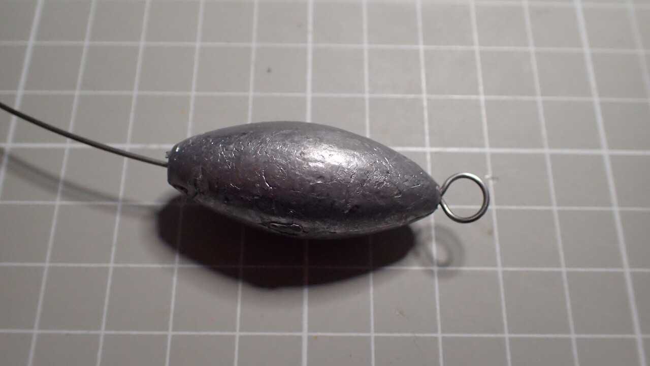 自分のタックルで扱える範囲でオモリを選択し、ホームセンターなどで売っているステンレスワイヤーを挿入してアイの形に整えるだけです。