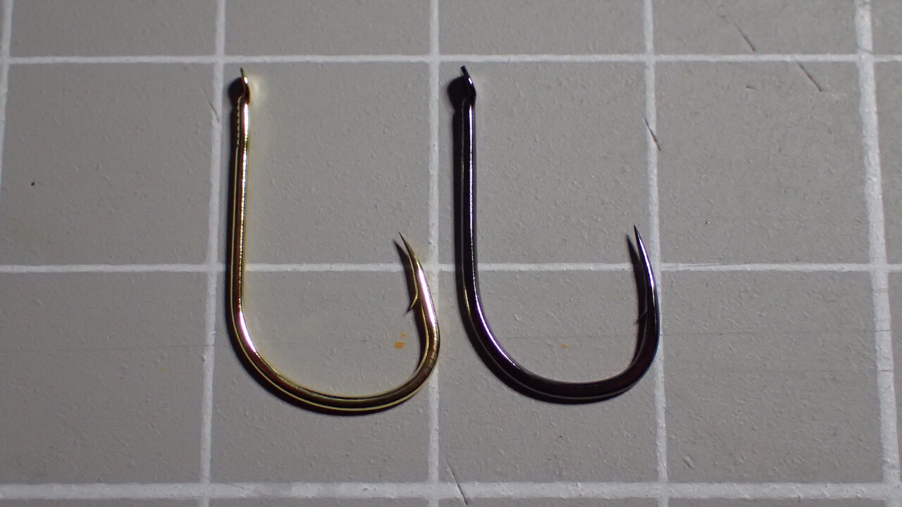 私は貫通力とバラシ軽減を考慮して針先が内向きのフックを愛用しているので、この二つに落ち着きました。