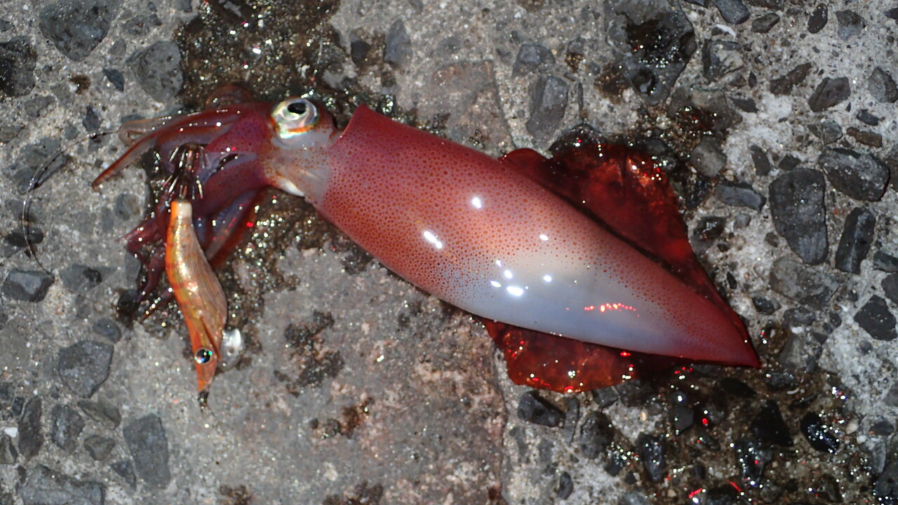 残念ながらメバルはシーズンオフ、アジはほとんどいないエリアだったため彼らは寄って来ませんでしたが、イワシ、サヨリ、カサゴ、ケンサキイカ、アオリイカ、シーバスは明かりに集まっていました。