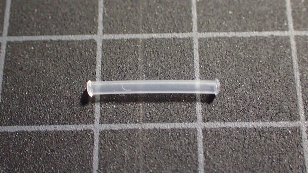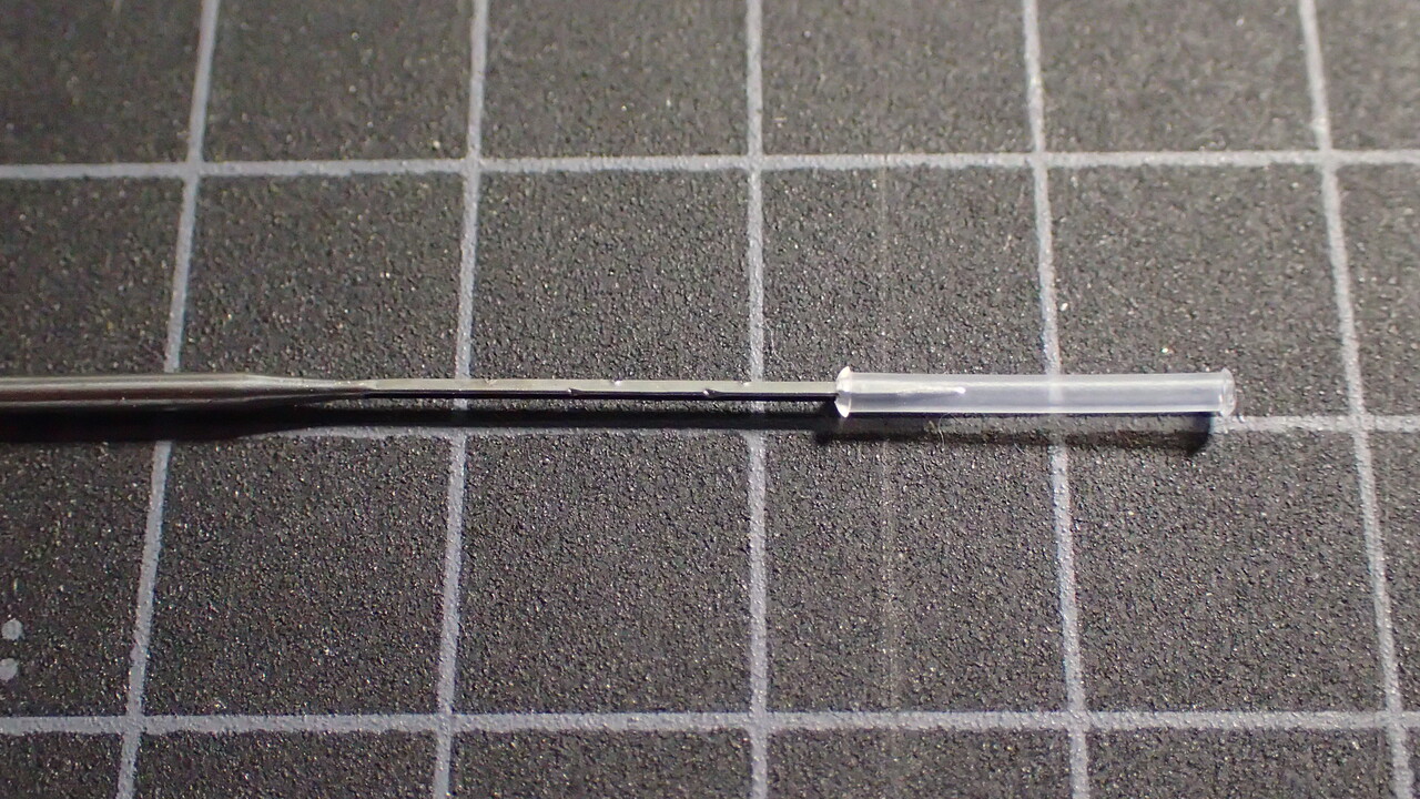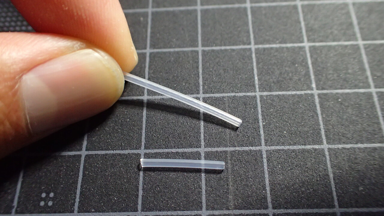 今回は0.6mmパイプを使用し、長さを1.5cmにカット、両端を火で炙って抜け防止としました。