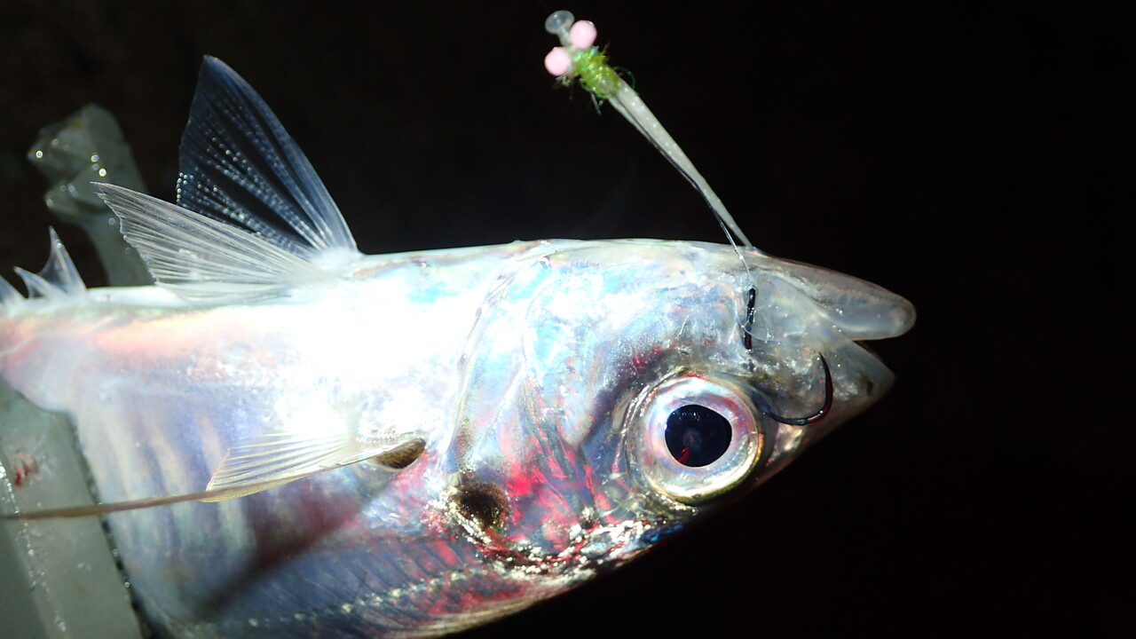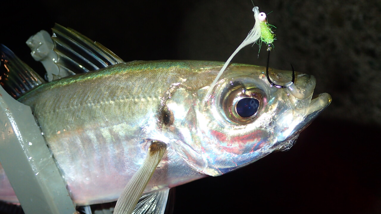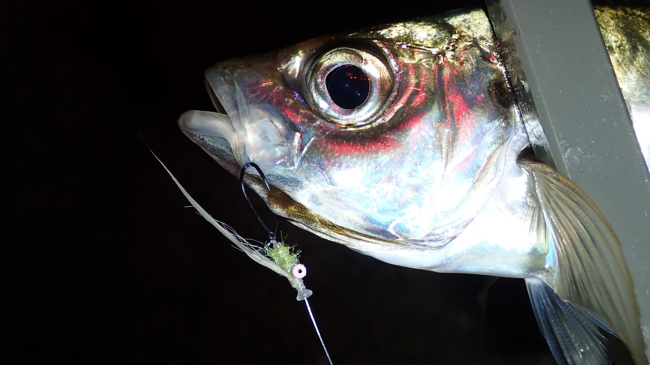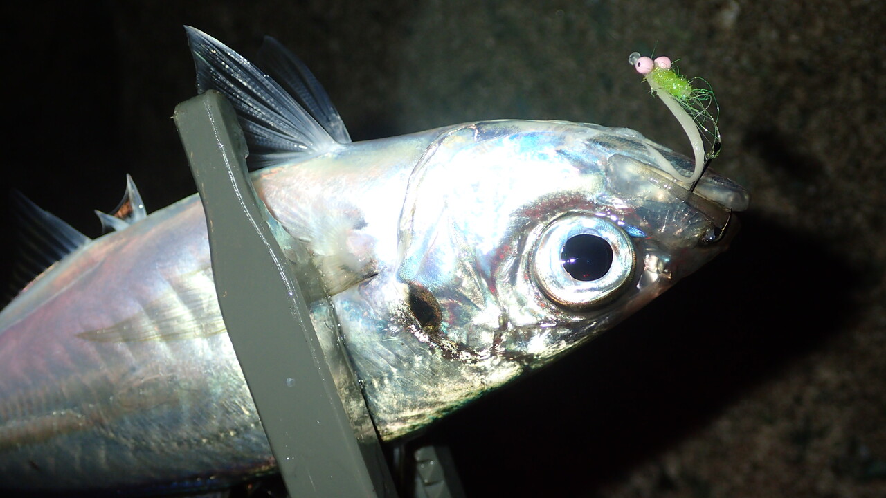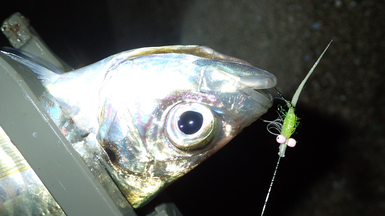 若干シルエットが太くなる為、スリムなフライでしか釣れないような状況は苦手としますが、それが影響するのはメバル狙いでそんな時もあるくらいで、ナイトゲームのアジは基本的にイージーに釣れてくれます。