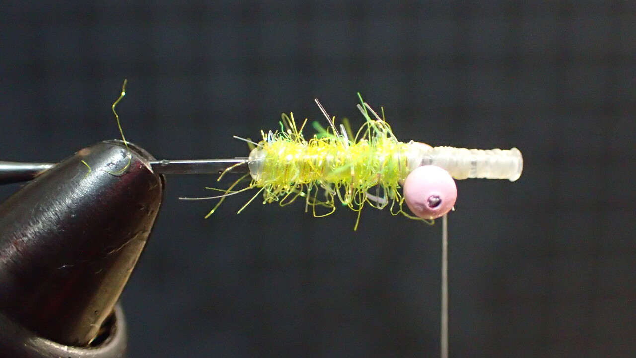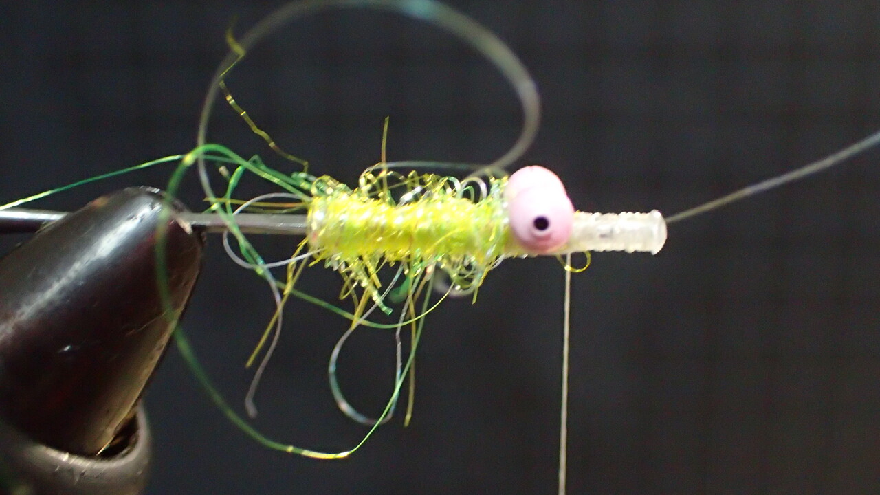 わかりやすいイメージを伝えると、ストローを2センチとか3センチにカットして、そのストローにタイイングをしたフライです。