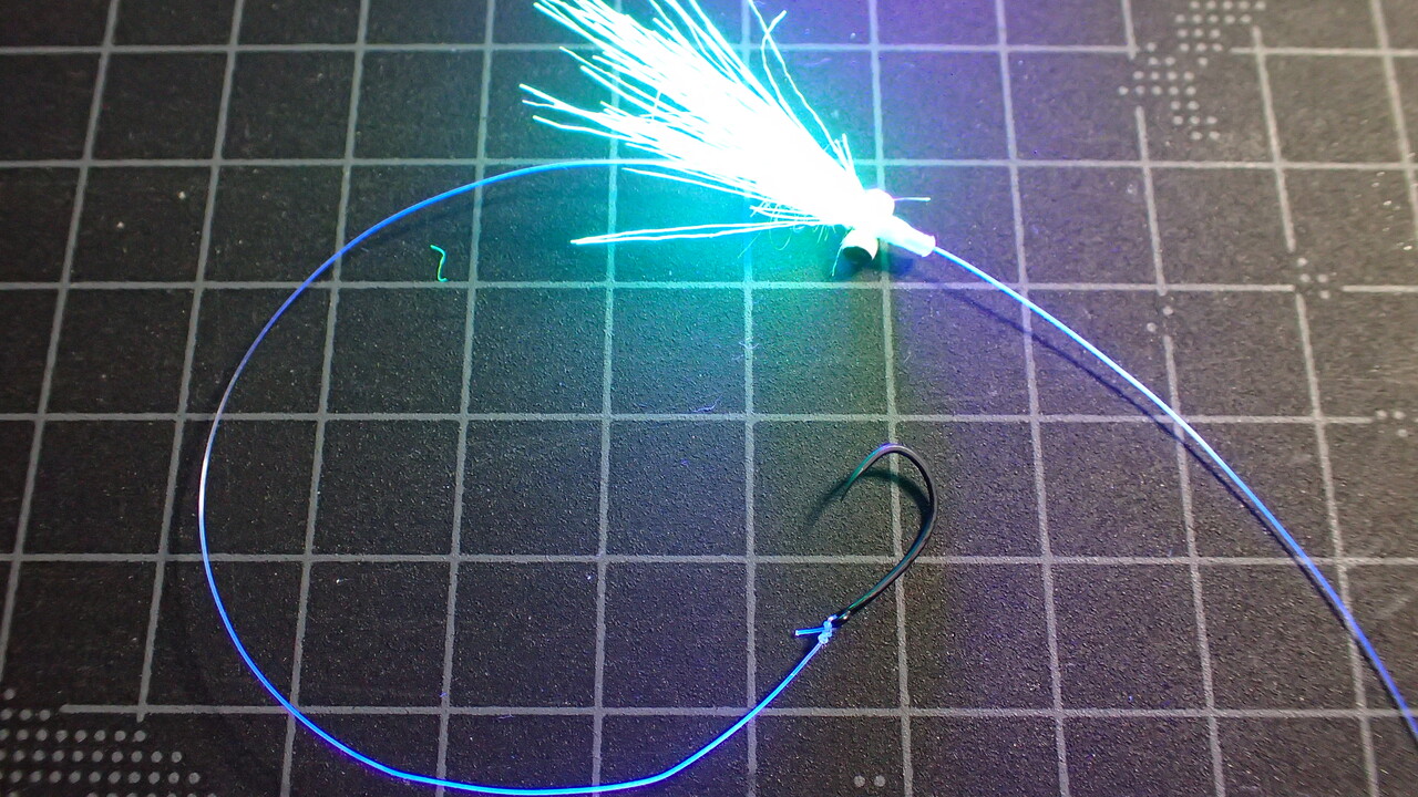 この写真のフライは0.8mmチューブを2センチ使って作りました。