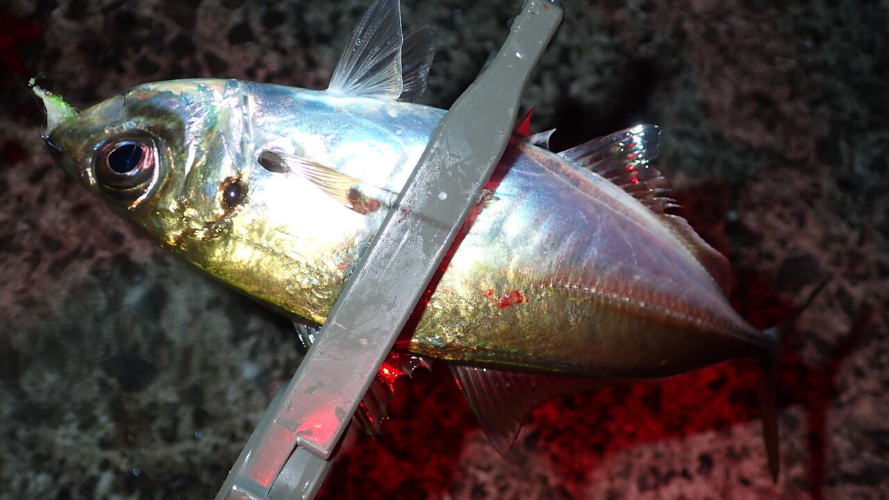 満潮から下げが始まった頃、最初のアジがヒットしました。