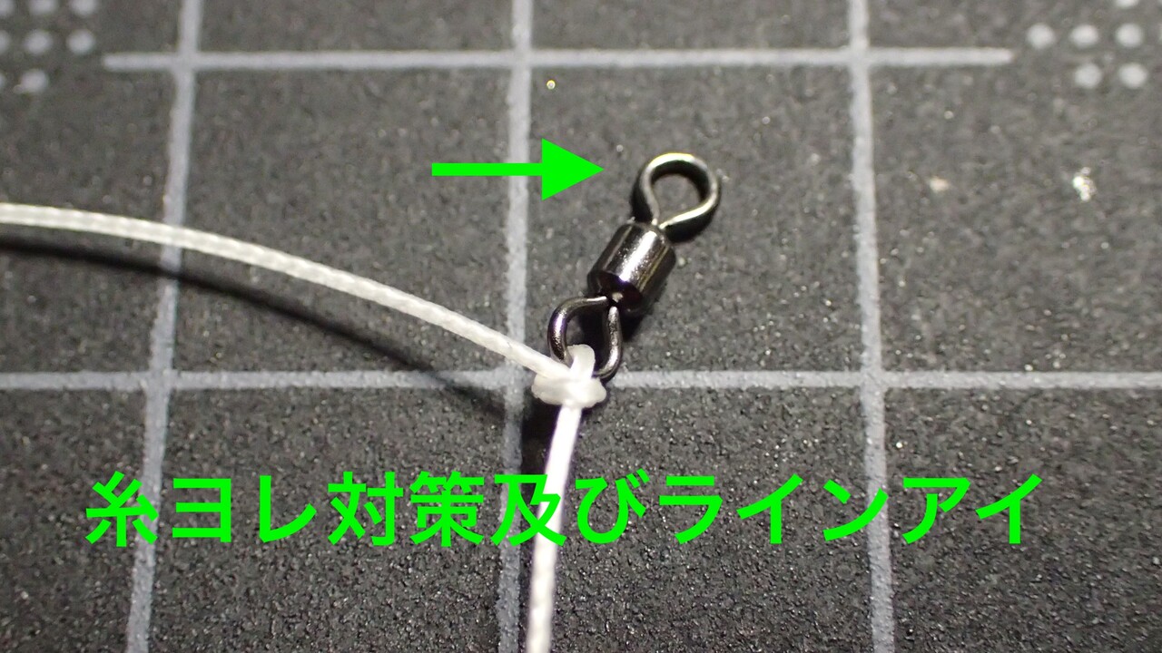 小さなヨリモドシを取り付けて、糸ヨレ対策及びスナップにセットするためのラインアイとして利用します。
