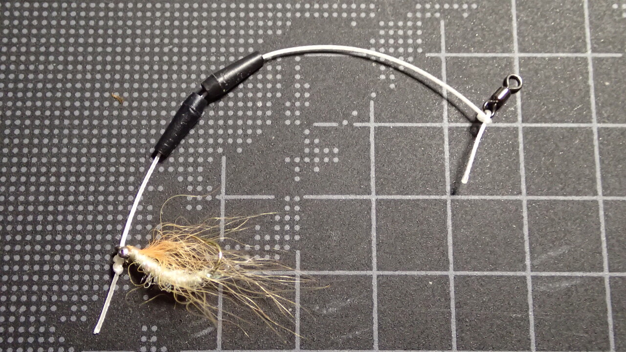 また、ラインはフライに直接結ぶのではなく、カブラと同様に八の字の結びコブに引っ掛ける方が姿勢の安定と動きの自由度が増して良い感じになります。