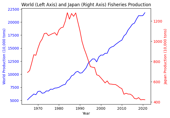 水産物総生産量(天然・養殖):青世界全体、赤日本