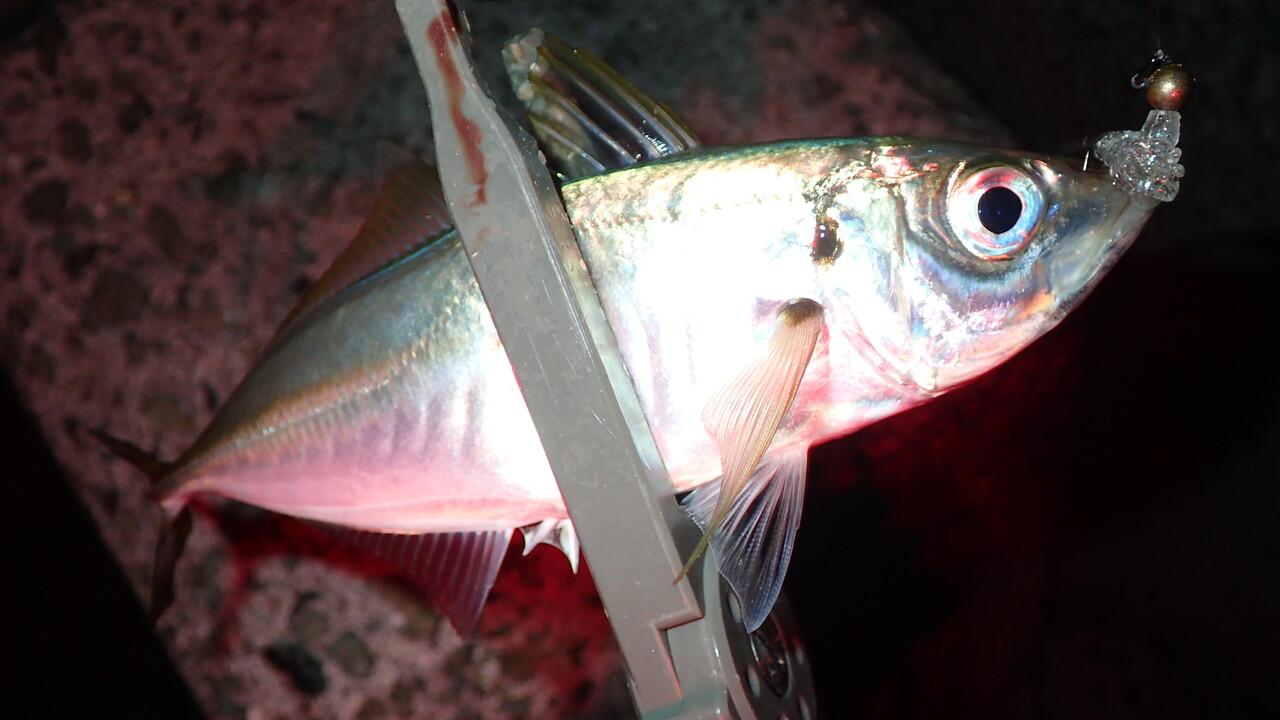 集魚灯の明かりの中でヒットしたのは22センチ程のアジでした。