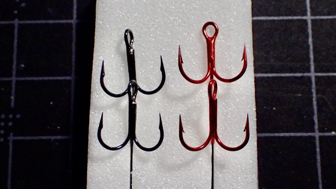 この画像左の加工済黒フックと、右の未加工赤フックを見比べると違いがわかりやすいと思います。