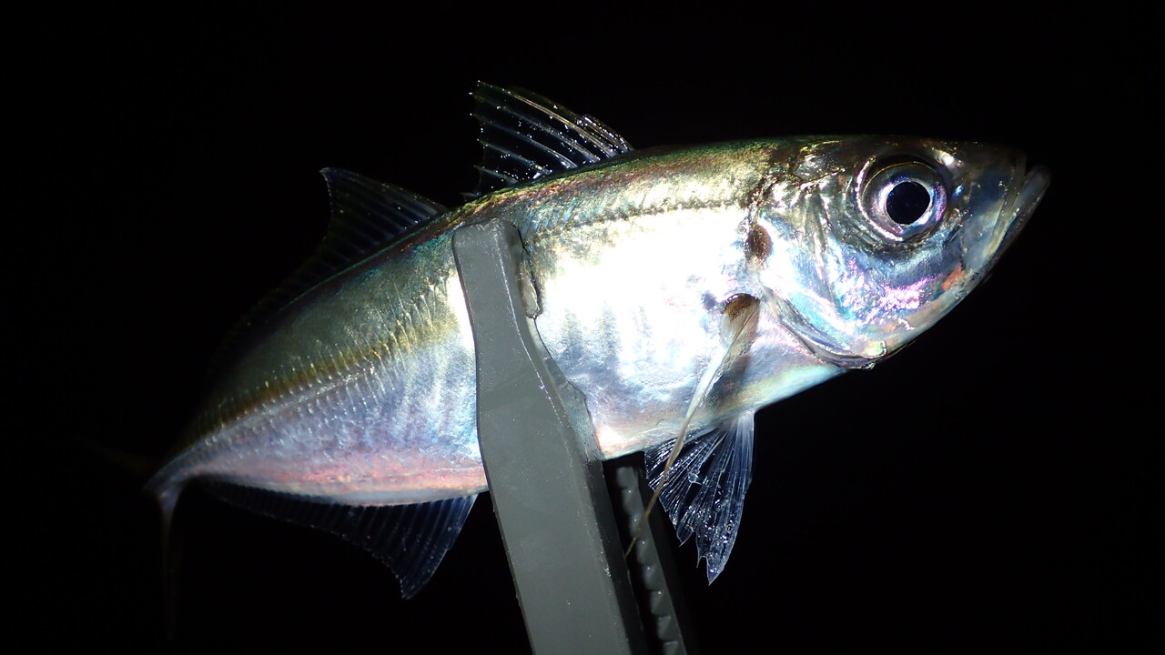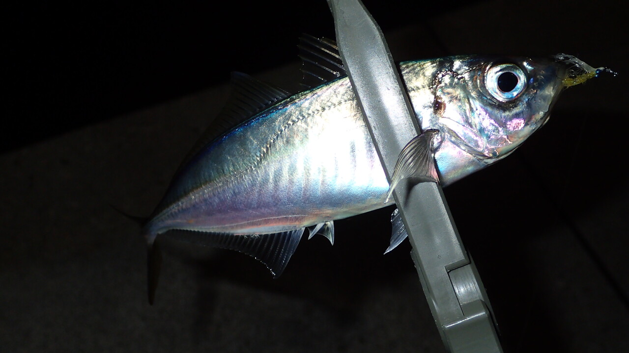 周辺を広く探っていると、18センチほどのアジもヒットしました。